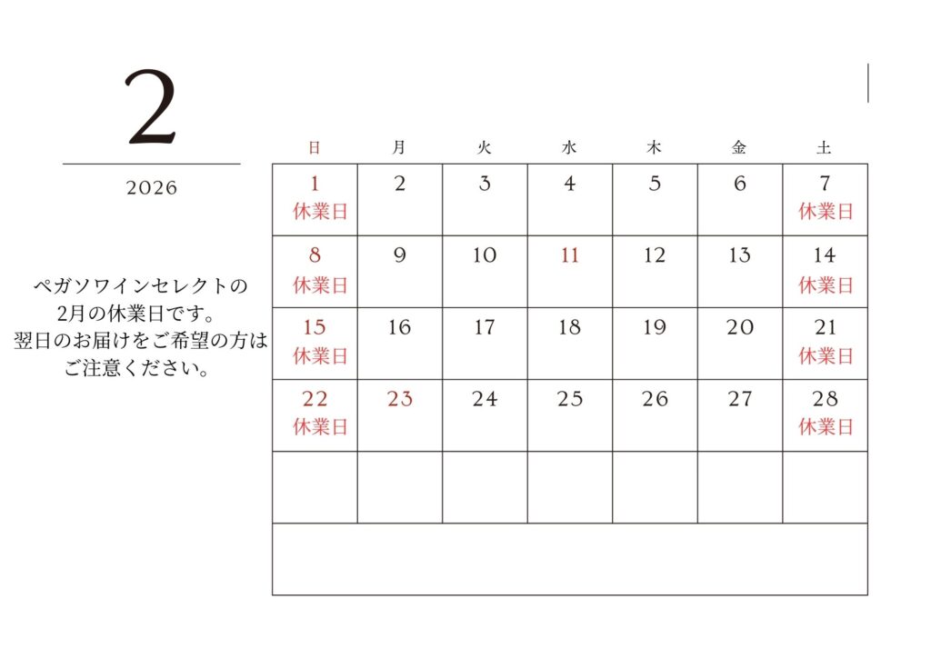 ペガソワインセレクト 2026年2月の休業日
